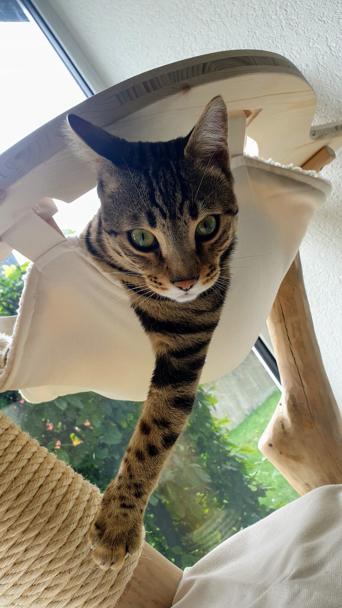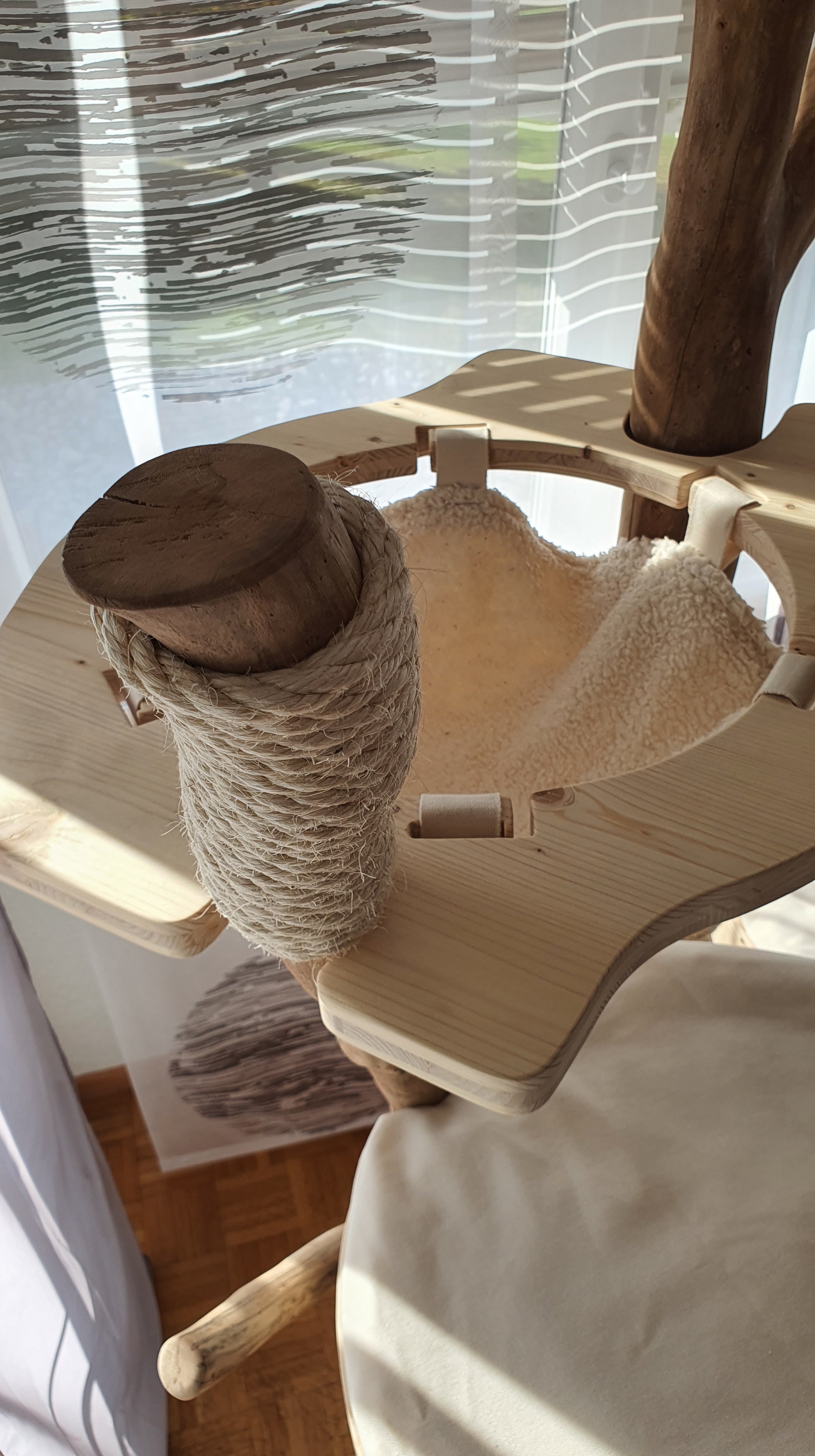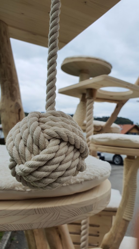 Si vous avez une ou des mesures précises et/ou que vous souhaitez respecter, nous vous dirons de quelle gamme il s’agit. Environ 25% de nos arbres sont des créations sur mesure. Les coussins et la corde en sisal sont compris dans le prix.